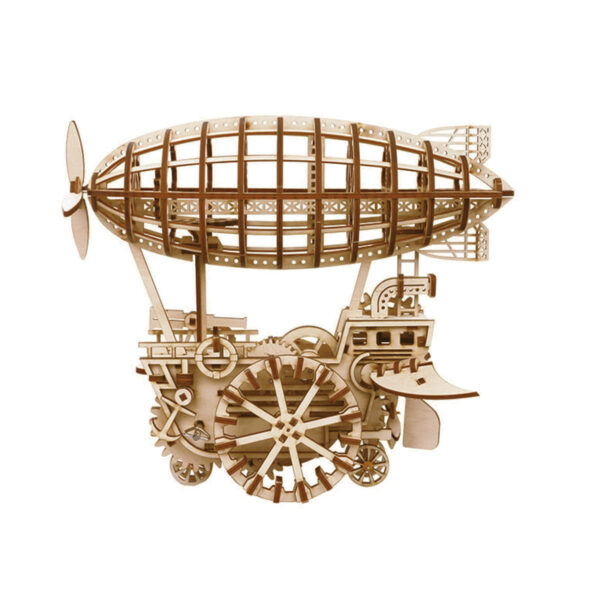 A retro-style mechanical airship model powered by wind-up spring, showing all the detailed structures and gears inside. Tons of fun to construct your own aircraft and watch it rushing out with its spinning propellers!